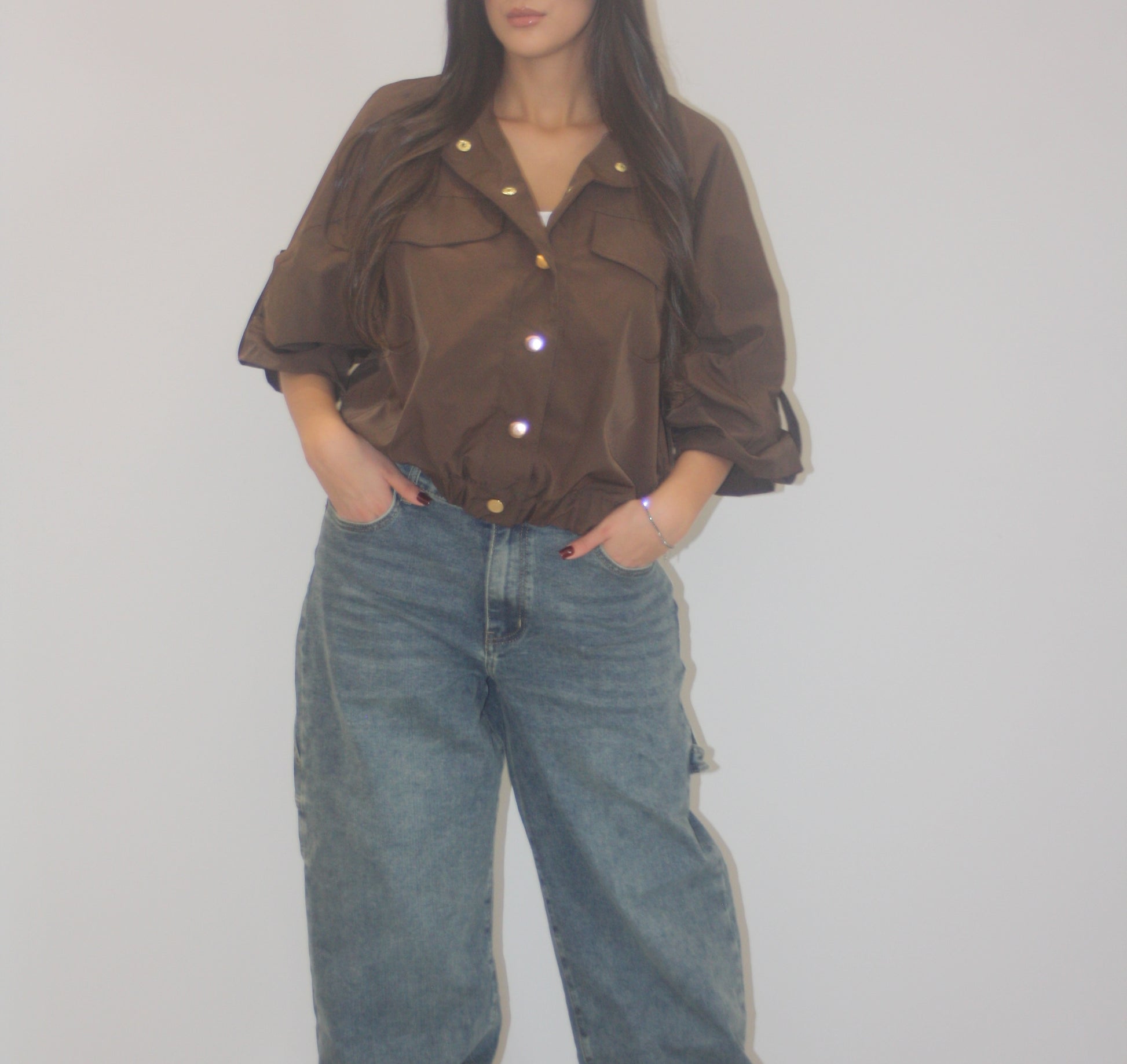 Un capo pratico e di tendenza, perfetto per la mezza stagione. Questo jacket corto è caratterizzato dalla molla in vita che valorizza la figura e dai bottoni frontali che aggiungono un tocco casual e versatile.