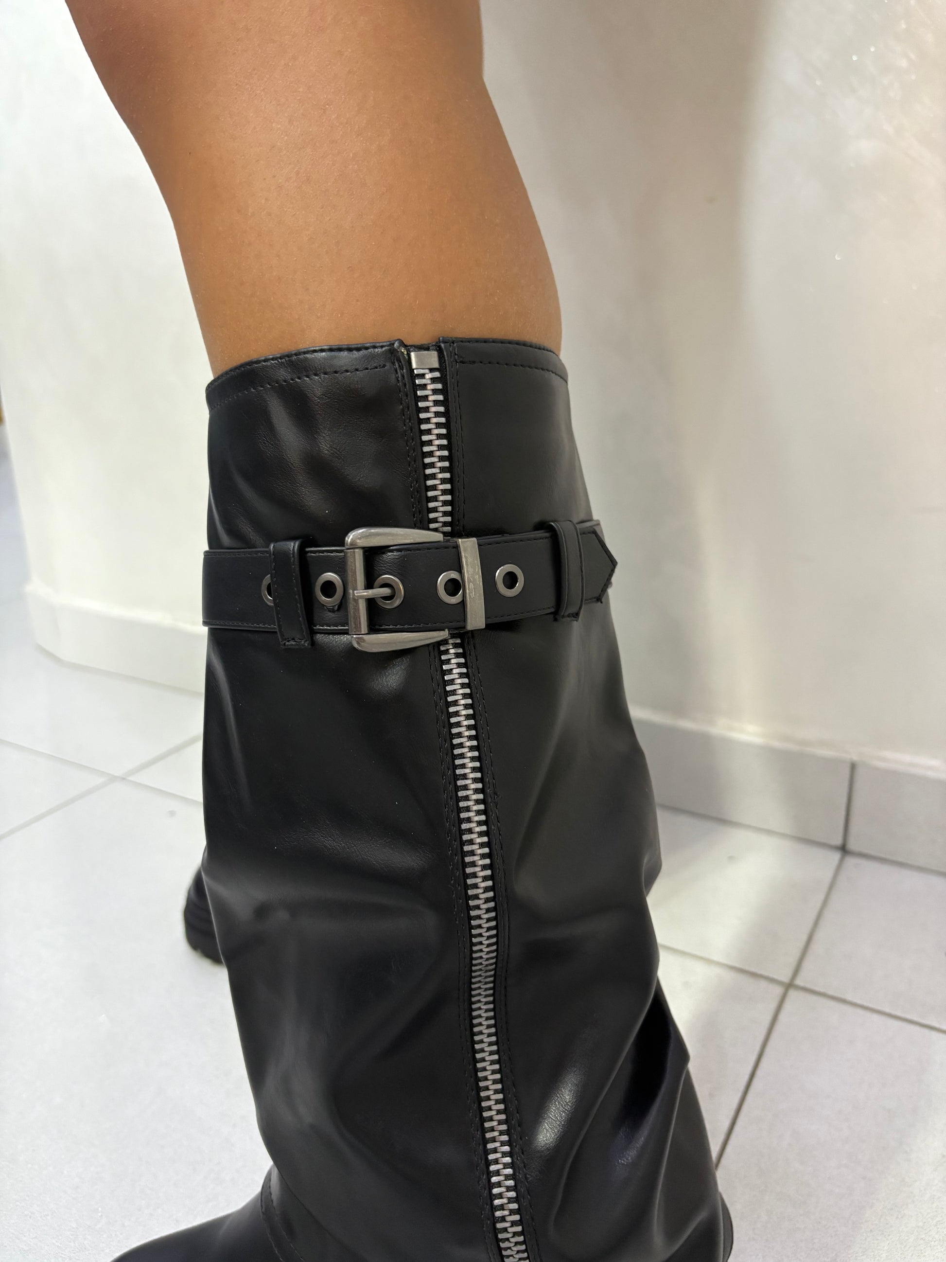 Dai carattere ai tuoi outfit con questi stivali da donna in ecopelle nera, perfetti per chi ama un look urban e grintoso. La suola carrarmato chunky garantisce stabilità e comfort anche nelle giornate più dinamiche, mentre la zip a vista e la fibbia con cinturino regolabile aggiungono un tocco rock di forte personalità.